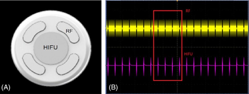 діаметром 2,5 см. (A) Маніпула SD пристрою (маніпула одночасної подвійної дії). Ультразвук випромінюється з точки в центрі робочої частини, RF – з електродів по краях. (B) Випромінювання двополярного RF з частотою 2 МГц та шириною імпульсу 80 мс чергується зивипромінюванням HIFU з частотою 7 МГц.