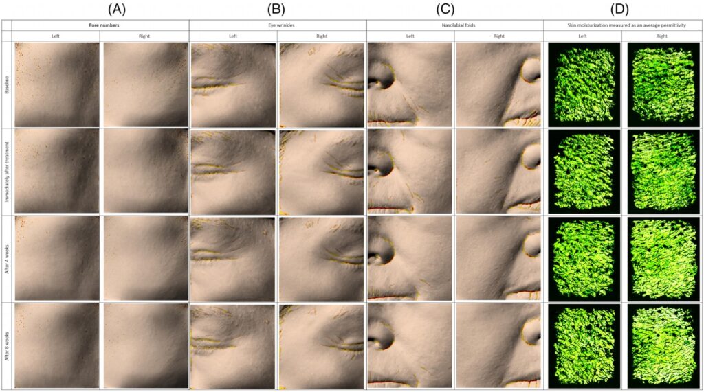 Дослідження оцінило омолодження шкіри, зокрема, стан пор за 7 показниками, еластичність, зморшки навколо очей, ліфтинг очей, ліфтинг вилиць, ліфтинг лінії нижньої щелепи та зволоженість шкіри. Вимірювання виконувалися на початковому рівні (до процедури), негайно після процедури та через 4-8 тижнів після процедури. Зміни стану шкіри отримували кількісний вираз за допомогою індексу оцінки, див. Таблицю S1–S3.