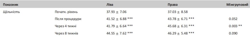 Щільність шкіри та її зволоженість на правій та лівій сторонах обличчя зростали одразу після процедури, а також через 4 і 8 тижнів після неї. Цікаво, що через 4 тижні після процедури на правій стороні обличчя спостерігалося значне збільшення щільності шкіри порівняно з лівою стороною, обробленою тільки HIFU.