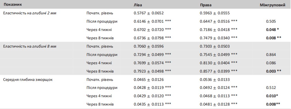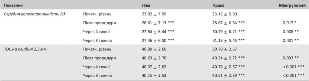 Початковий рівень, негайно після процедури, через 4 тижні, через 8 тижнів – порівняння. Середній показник загрубілості Ra; *p-рівень < 0.05, **p < 0.01, ***p < 0.001.