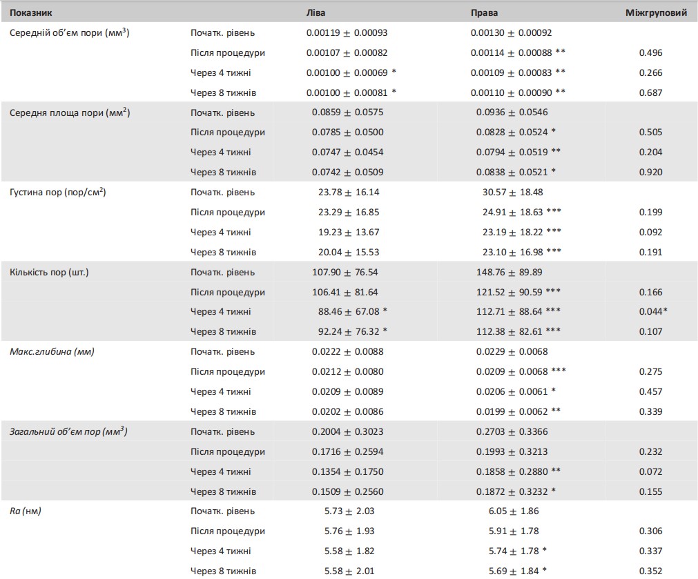 Ліва щока (HIFU): показники об’єму пор і кількості пор істотно покращилися, в той час як показники середньої площі пор, густини пор, максимальної глибини пор, загального об’єму пор і середня загрубленість шкіри (Ra) не покращилися істотно. Права щока (HIFU+RF): всі показники середнього об’єму пор, середньої площі пор, густини пор, кількості пор, максимальної глибини, загального об’єму пор та Ra істотно покращилися.