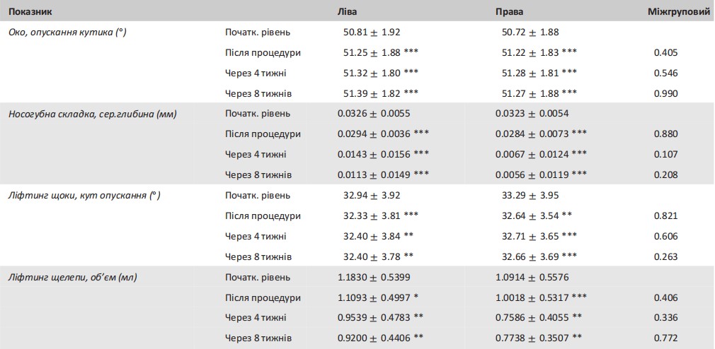 Початковий рівень, негайно після процедури, через 4 тижні, через 8 тижнів – порівняння. *p-рівень < 0.05, **p < 0.01, ***p < 0.001.